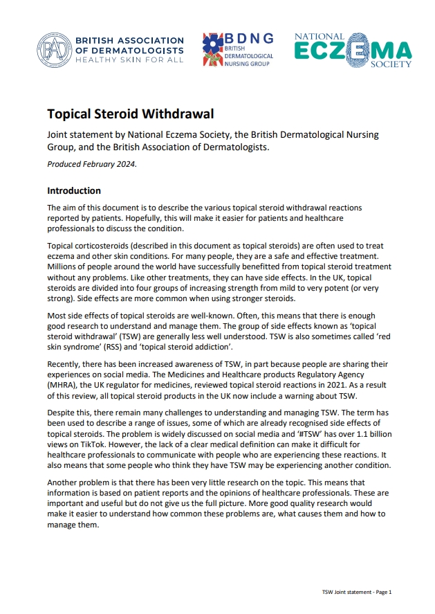 Our statement on topical steroid withdrawal with the British Association of Dermatologists and British Dermatological Nursing Group.