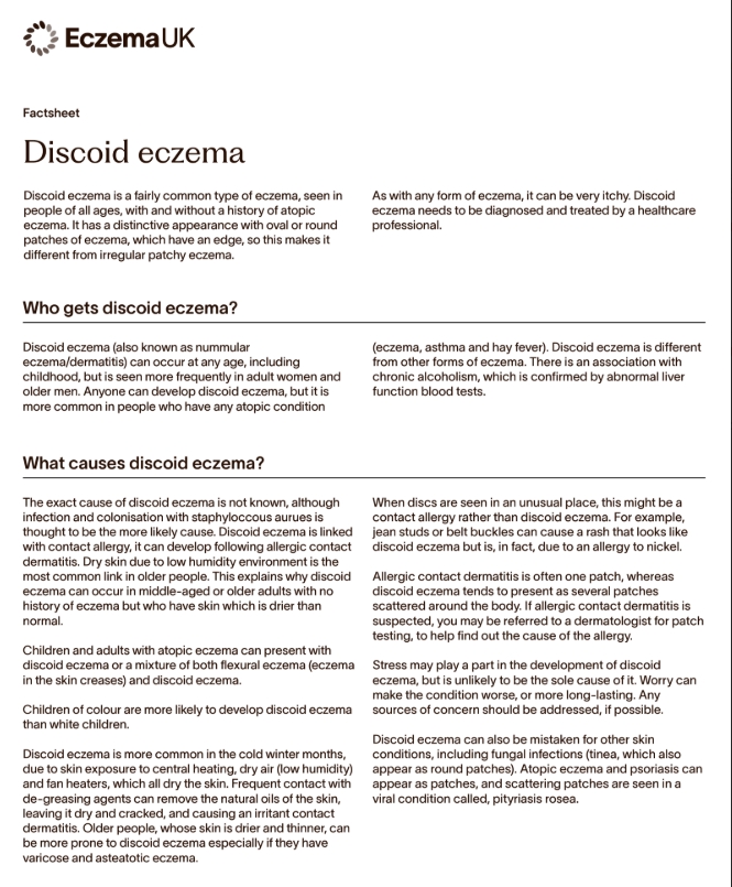 Discoid eczema (also known as nummular eczema/dermatitis) is a fairly common type of eczema that can occur at any age, including childhood, but is seen more frequently in adults. It has a distinctive appearance with oval or round lesions, and can be very itchy.